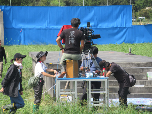 撮影現場は、原っぱで手入れを怠るとすぐに雑草が伸びてしまう場所であった為、撮影日程に合わせての草刈りや、近くの川の土手から「カヤ」の草の運び入れなど、撮影に入る前の準備が大変でした。また、桜が散り始めた4月は肌寒く、5月、9月は真夏のような暑さが続いたり、台風の接近により、ブルーシートの点検補強を行いながら撮影を行いました。そんな中長期にわたり、監督、スタッフ、キャストが全力で撮影をしていた作品です。