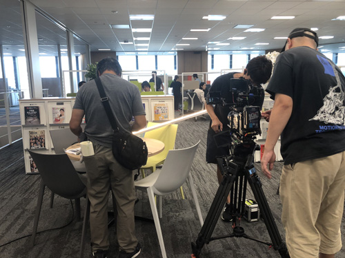 当日は、セゾン情報システムズオフィスが外資系商社オフィスとして撮影が行われました。冗談を言うセリフが多いシーンだったので、立会っていただいた施設担当者の方々も楽しんで見学されていました。また、スマートフォンアプリがストーリの中に度々登場するので、スマートフォン画面だけを撮影する場面もありました。どんなシーンになるのか楽しみです。配信、放送をお楽しみに!