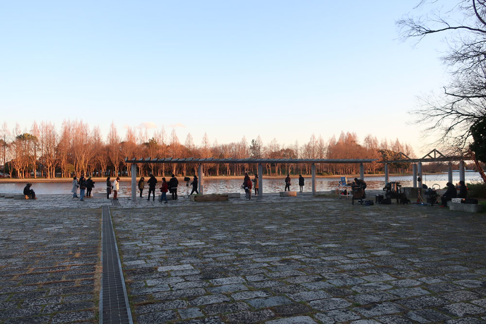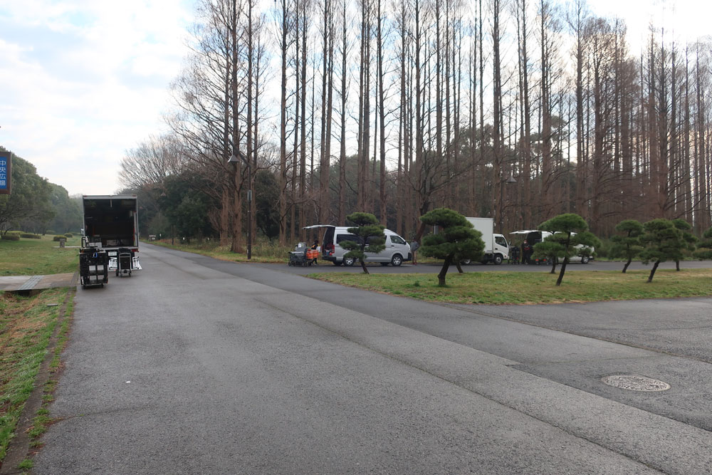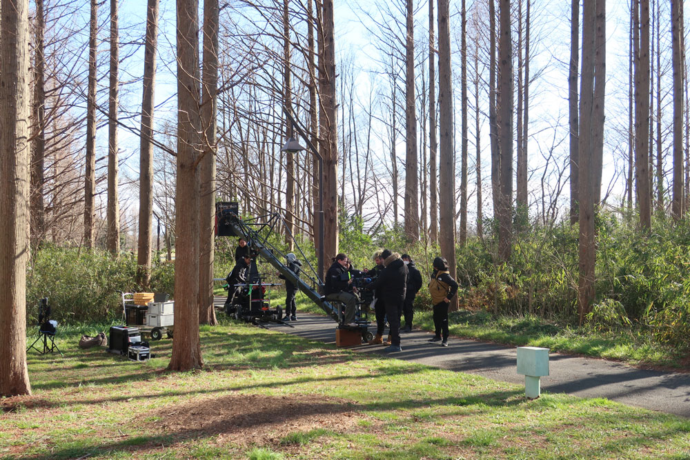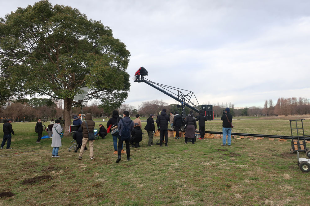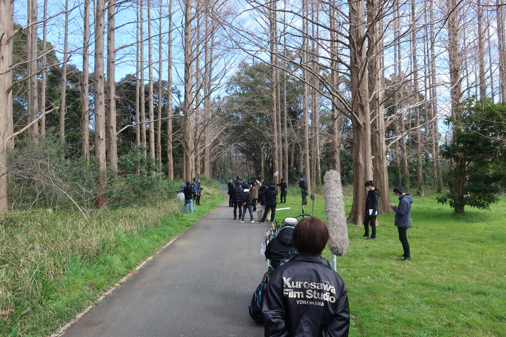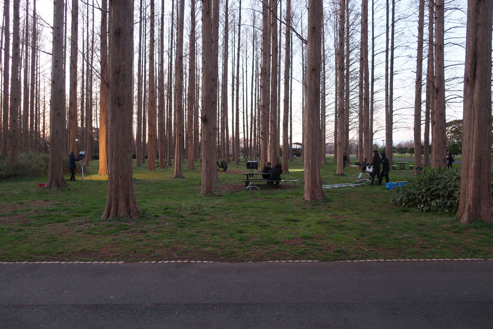 「生きた化石」として知られているメタセコイヤの森と記念広場で2日間に渡って撮影されましたが、そのうちの1日は春の嵐とでもいうような突風が吹きすさみ、小松菜奈さんの髪の毛が突風で舞い上がり、撮影どころではない…という場面もしばしばありました。スタッフが工夫を凝らして風を防ごうとするも歯が立たず、タイミングを見計らって撮影しなければならず、映画というフィクションの世界を作り上げる制作陣の苦労を感じる撮影でした。