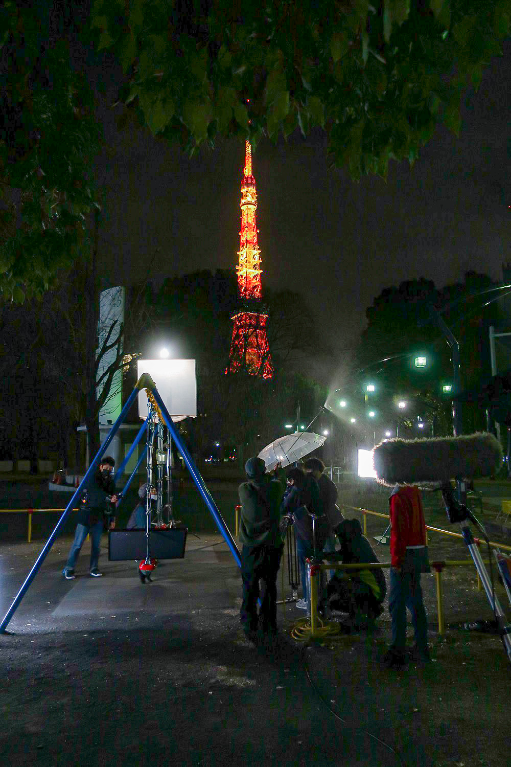 船越英一郎さんが公園のブランコに座りながら雨に打たれるというシーンの撮影で、小型のポンプを用意し、小規模な範囲で雨を降らしました。