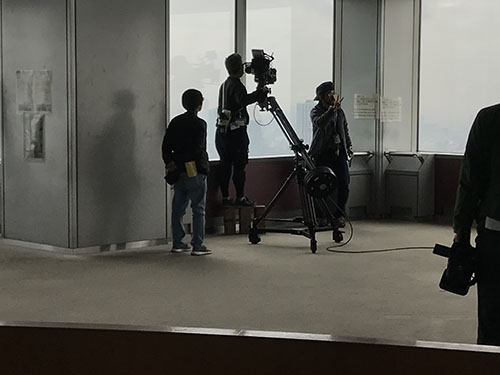 都庁南展望室でのロケ撮影は、毎日訪れるたくさんのお客様に迷惑のかからないよう、開室前の早朝に行われました。このシーンのテーマは、野望を抱く主人公の決意表明。展望室からの壮大な東京の眺望が、俳優の演技に一層の厚みを加えています!乞うご期待!