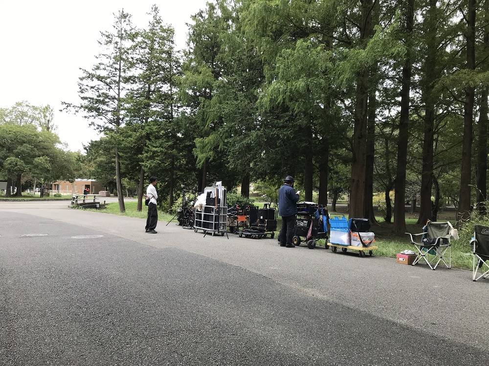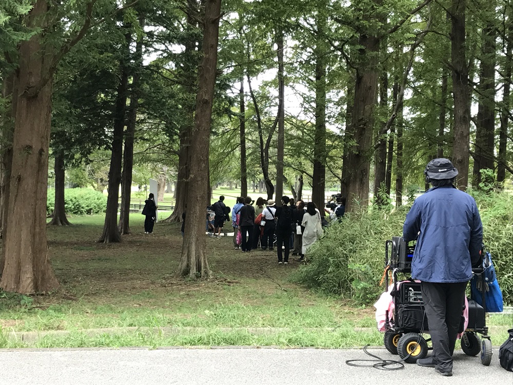 快晴の水元公園。ロケ車両を直近の臨時駐車場まで乗り入れ、運び込んだ機材類や劇用のベンチ。早朝からの準備で万全に整った撮影現場に主役の吉岡里帆さんと永山瑛太さんが支度を終えて到着すると、メタセコイヤの森にまだ暑い日差しの降り注ぐなか、撮影は始まりました。散歩やランニング、ドッグランで犬を遊ばせる人たちもいましたが、カメラが向けばとても協力的に場所を移動していただいたり少しの時間お待ちいただいたりと順調に進み、予定時間内にすべての撮影を終了できました。