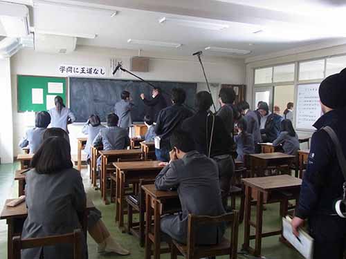 忌野清志郎さんの出身校である東京都立日野高等学校の全面協力で実現した今回の撮影。4日間に渡る撮影では1960年代の日野高校を再現するべく、美術や装飾、髪型や言葉遣いに至るまで細かい調整・演出が行われました。現職の校長先生をはじめ、副校長先生や美術の先生にもご協力頂き、教室、美術室、美術準備室などで撮影を行いました。なんと現役の日野校生もエキストラとして出演して頂いています!