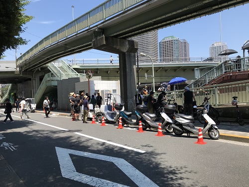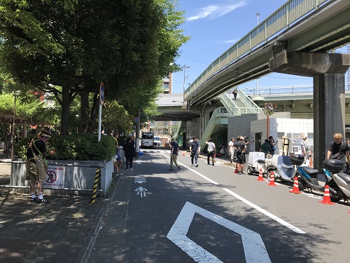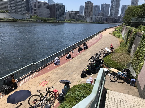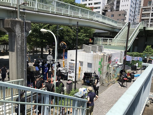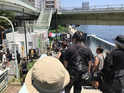 隅田川下流の橋袂に、つづら折りのスロープをもつ歩道・自転車道があります。映画「本心」では、主人公の池松さんたち「リアル・アバター」のたまり場として度々登場する景色です。撮影は、時折通る自転車や歩行者を気遣いながら、淡々と行われました。