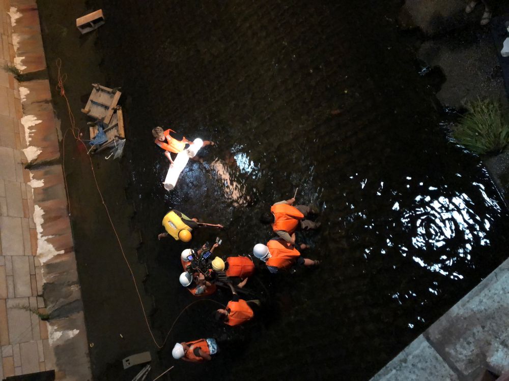 8月8日は神田川の桔梗橋で撮影が行われました。本来なら前日8月7日予定でしたが、ゲリラ豪雨で神田川の水嵩(かさ)があっという間に上がり茶色の濁流となってしまい、日程変更を余儀なくされました。ところが、翌8日は夏の太陽がこれでもかという位に注ぎ、補給しても補給しても体内に水分が無くなってしまうようでした。許可を得て神田川に入った制作担当たちは汗だくになりながらイントレを組み、撮影の準備を始めます。何度もテイクを繰り返しやっと日を跨ぐ少し前に撮影が終了し、ロケ隊は現場を後にしました。